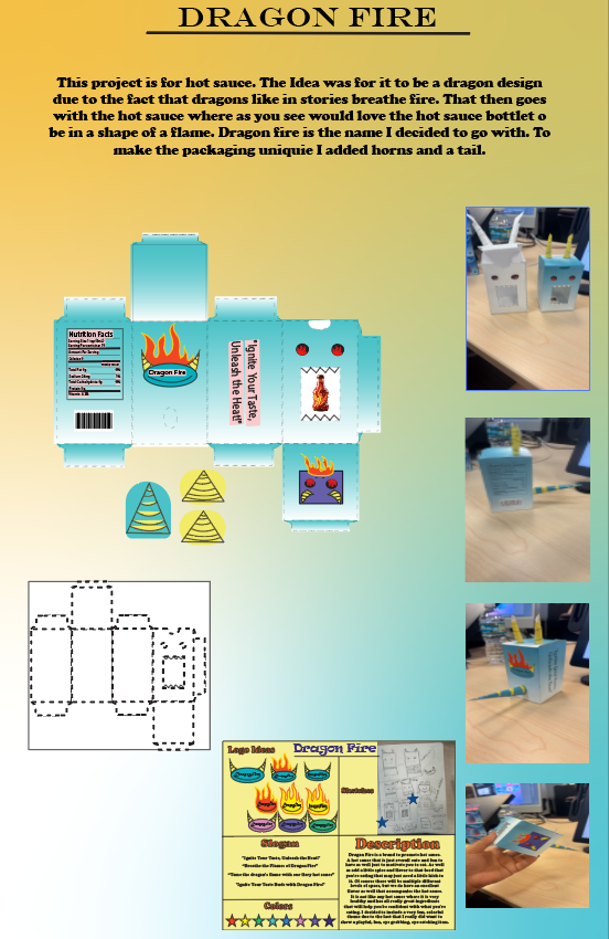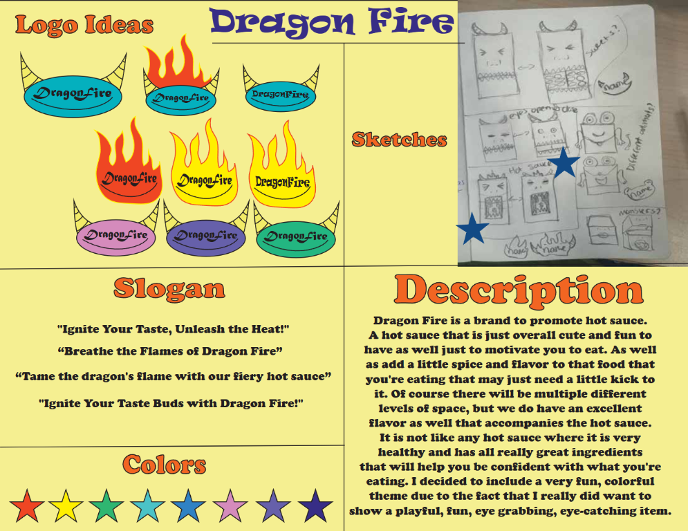 Dragon Fire is a Brandt rounding hot sauce. Hazards brands are usually very simple or very edgy. In my design, I really wanted to bring out some different vibes and playful vibes to hot sauce. Hot sauce is something that can be very intimidating to people to try out to the fact that people do struggle with heat. So, I believe that maybe if you do bring more of a better approach and a more positive approach, it will be less. Tending to approach it will just overall attract more people, even people that don't necessarily have hot sauce a lot.